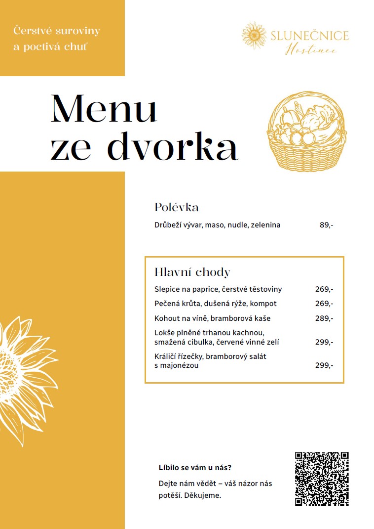 Menu ze dvorka je pro nás návratem k tomu, co máme rádi – jednoduché, kvalitní jídlo připravené s péčí a respektem k surovinám.